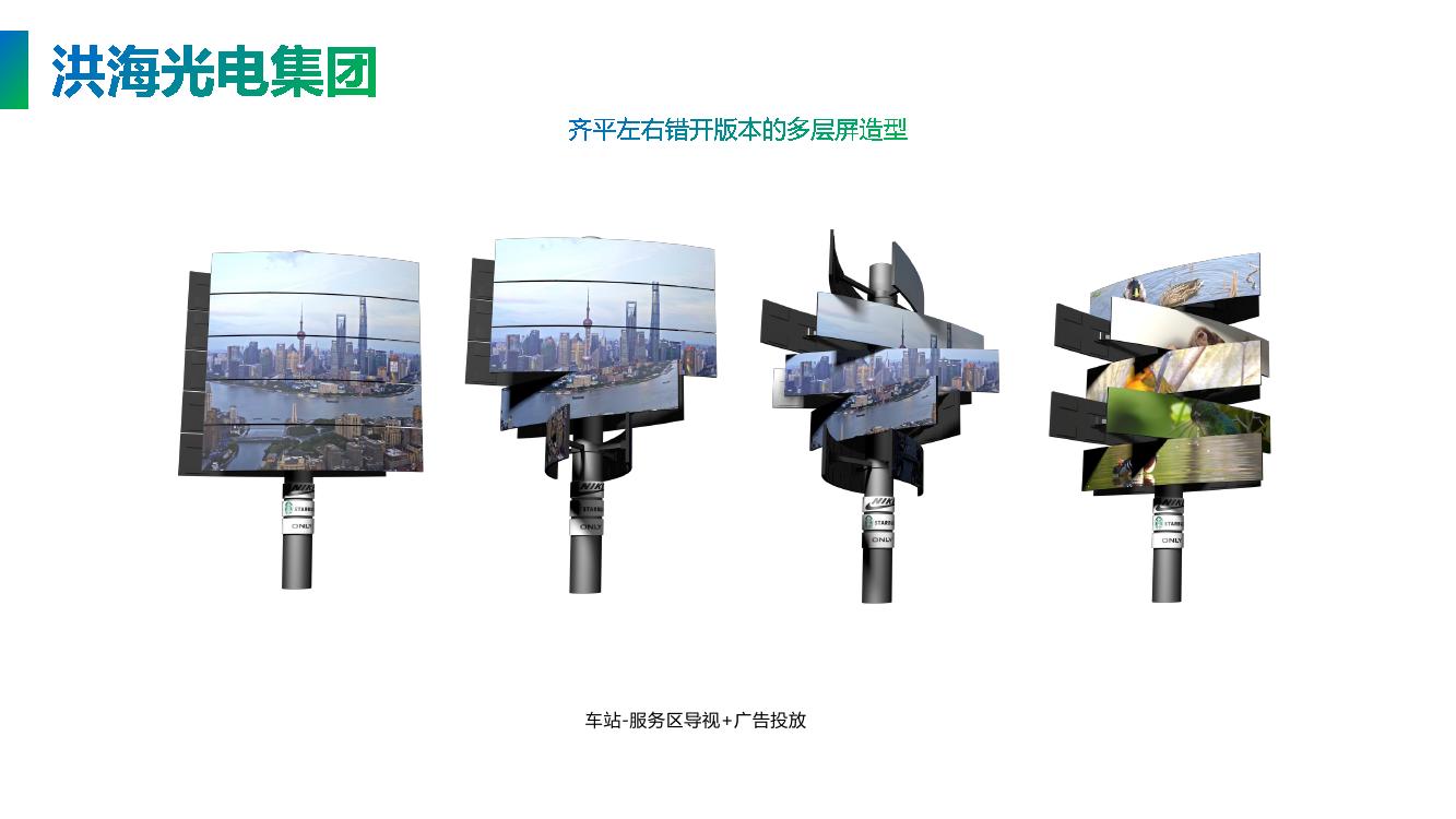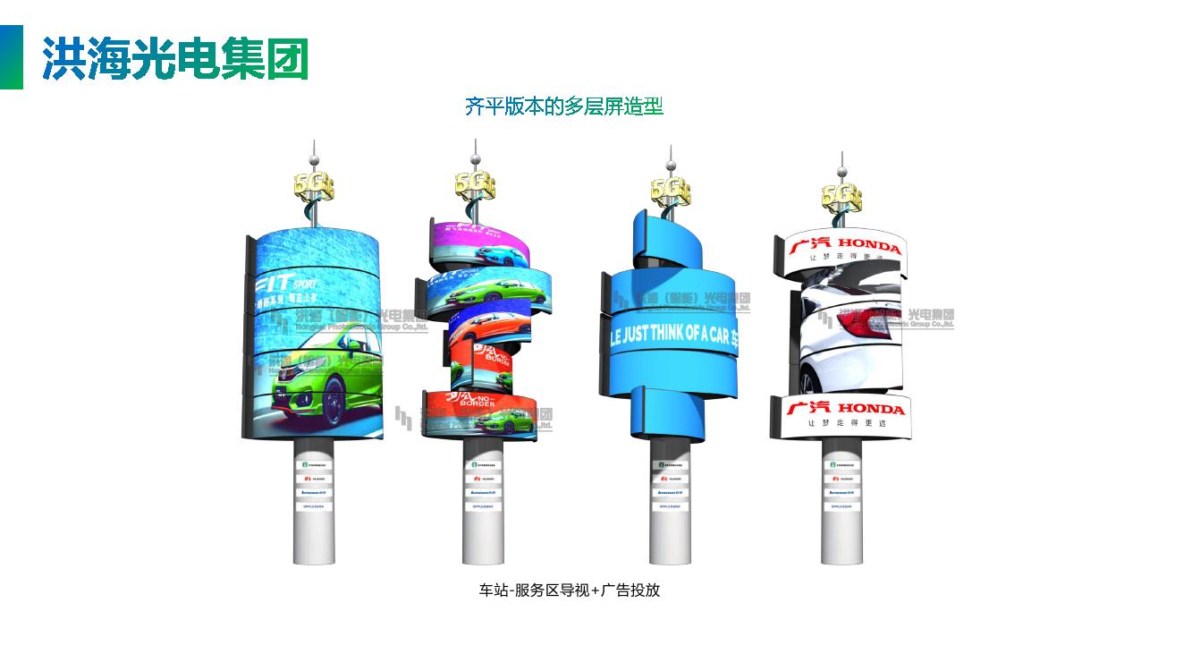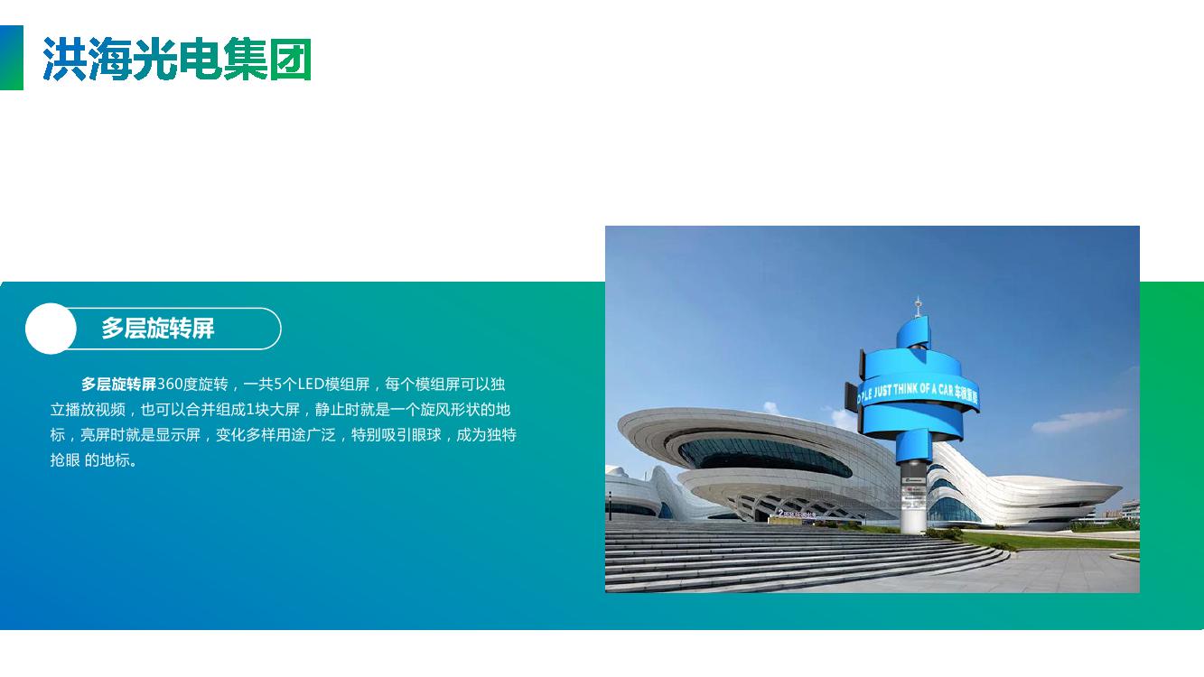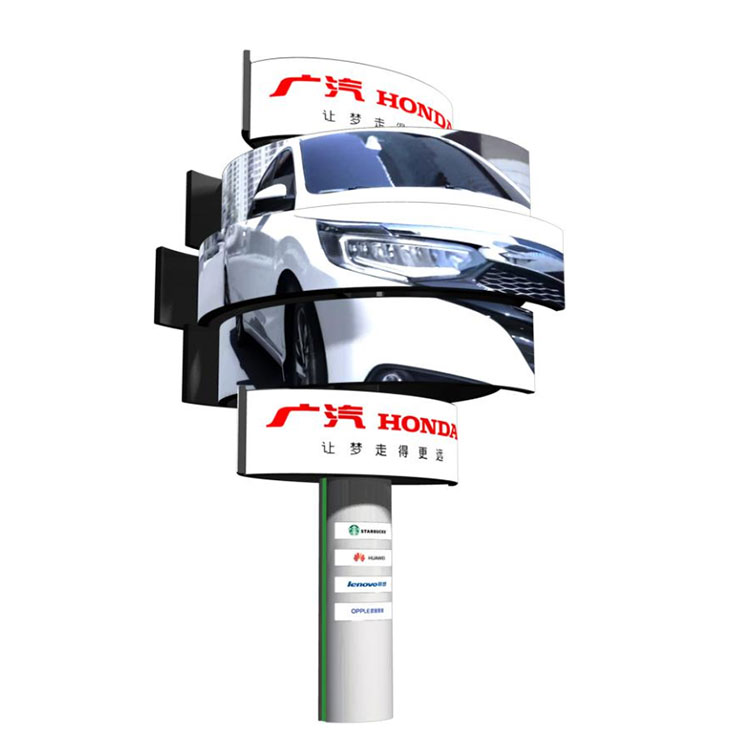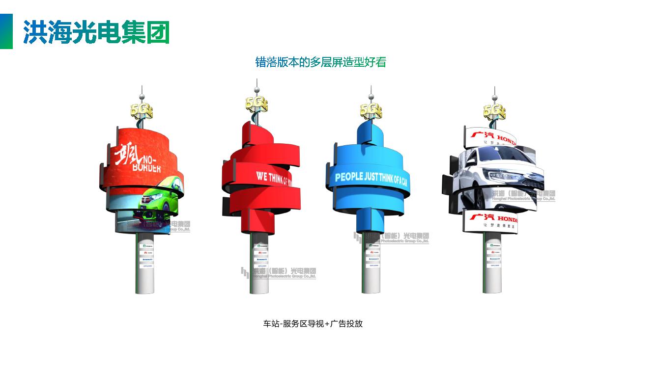 多層旋轉(zhuǎn)屏360度旋轉(zhuǎn),一共5個LED模組屏,每個模組屏可以獨立播放視頻,也可以合并組成1塊大屏,靜止時就是一個旋風形狀的地標,亮屏時就是顯示屏,變化多樣用途廣泛,特別吸引眼球,成為獨特搶眼的地標。