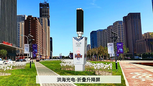 當(dāng)升降折疊屏不工作的時候,外面像一個廣告柱子,可以做標(biāo)牌使用。