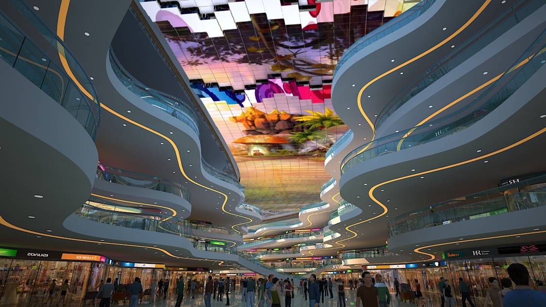 全球掀起天幕熱潮,低碳環(huán)保,美化亮化城市,成為城市宣傳的熱點(diǎn)。天幕,曾經(jīng)出現(xiàn)在科幻電影里,如同一塊夢(mèng)幻的天空,籠罩在未來都市的上方。什么是天幕,簡單來說,天幕就是橫亙?cè)诳罩械囊粔K巨大的LED全彩顯示屏,利用聲、光、電等技術(shù)手段,營造璀璨星空、夢(mèng)幻海洋、美麗花海等畫面,配合各種照明亮化燈帶和三維聲像擴(kuò)聲系統(tǒng),給人震撼的視聽享受。